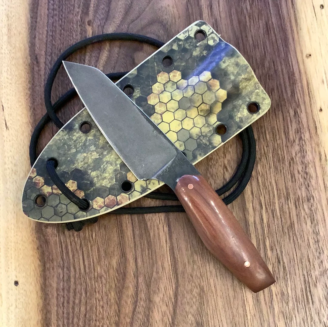 The KTB is a new neck knife design featuring a K-tip which allows for easy utility cuts and a sharp point for piercing. This one has a stonewashed D2 blade with a stabilized Cedar handle and two copper pins. This knife also comes with a green hex Kydex neck sheath.